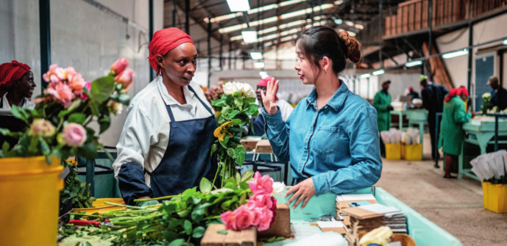 湖南璽悅國際貿易有限公司負責人黃梓楠(右)在肯尼亞納紐基的坦布濟花卉農場挑選鮮花(2024年5月18日攝)王冠森攝 / 本刊