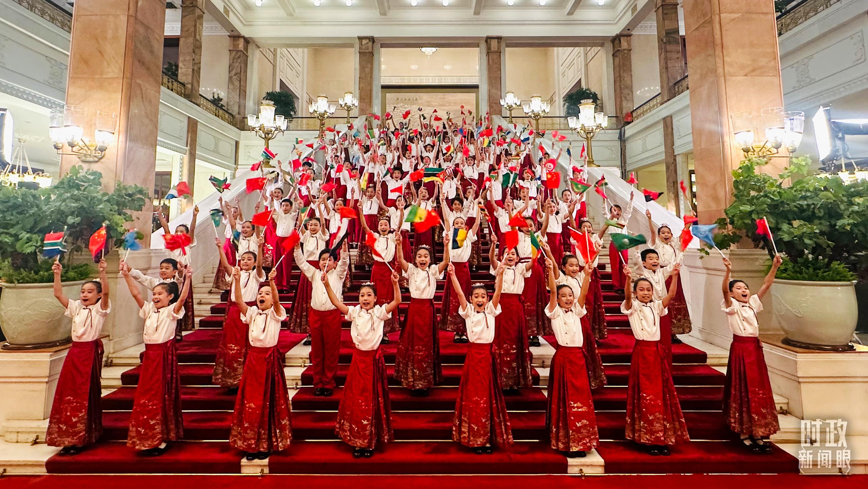 壁畫緩緩打開,百余名身著中國(guó)傳統(tǒng)服飾的少年兒童揮舞著旗幟,熱情演唱《把未來點(diǎn)亮》、《歌聲與微笑》、非洲歌曲《Waka Waka》等。