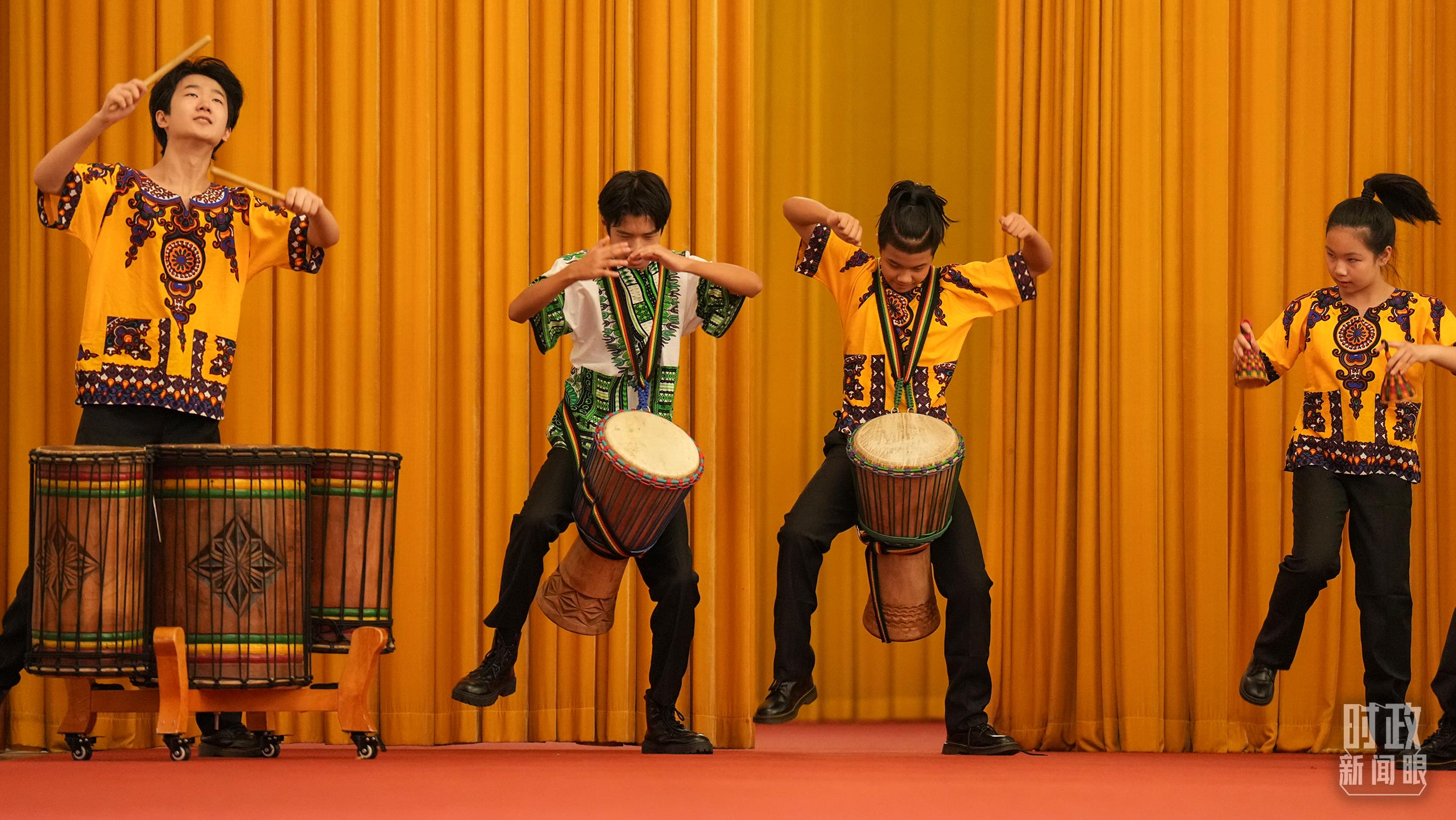 在前往宴會(huì)廳沿途,身著中國(guó)民族服裝和非洲特色服裝的青少年,打起歡快的非洲鼓,載歌載舞歡迎遠(yuǎn)道而來的貴賓。