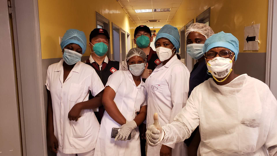 2020年5月26日,中國抗疫醫(yī)療專家組在剛果(布)首都布拉柴維爾指導(dǎo)新冠肺炎病房建設(shè)時,與當(dāng)?shù)匾痪€醫(yī)務(wù)人員合影。新華社發(fā)