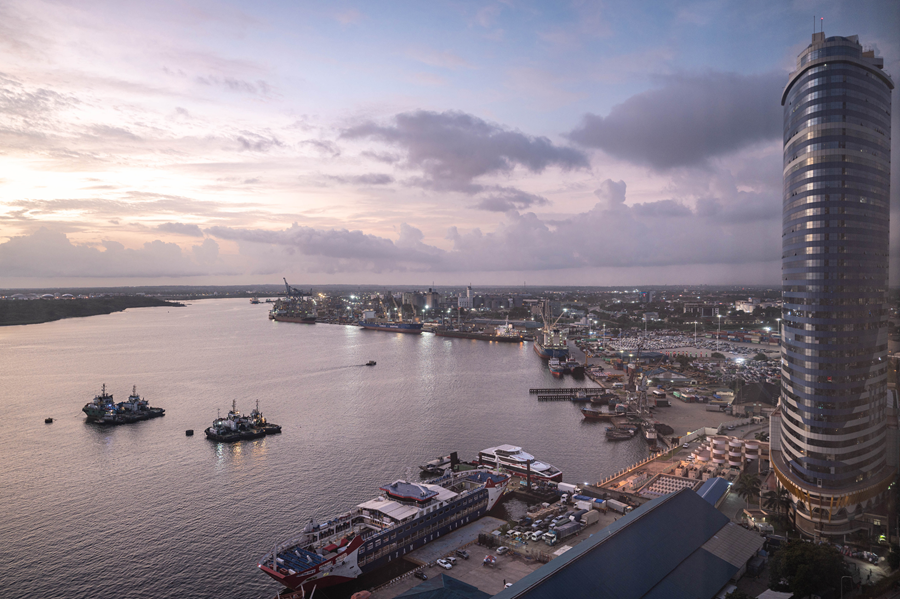 這是2023年12月29日拍攝的日出時分的坦桑尼亞達累斯薩拉姆港。新華社記者 王冠森 攝