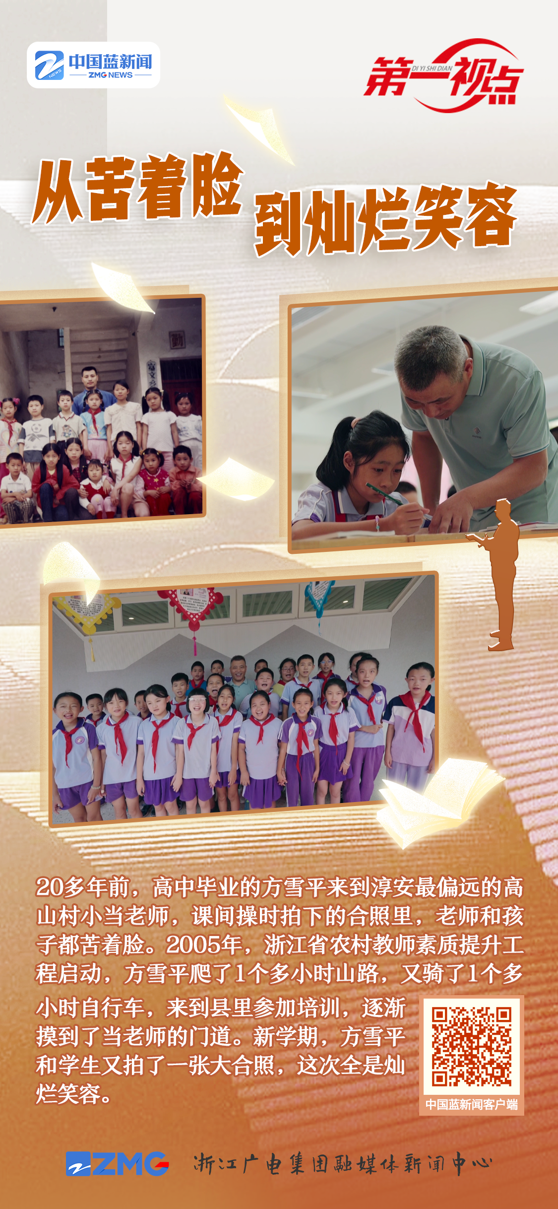 彼時的浙江,小學(xué)教師的學(xué)歷達標(biāo)率,在全國排位倒數(shù)。高中畢業(yè)的農(nóng)村老師方雪平,來到淳安最偏遠的高山村小。一個人,要教兩個年級20多個孩子的全部科目。一次課間操時,村小老師拍下的照片,無論是老師還是孩子,一個個都苦著臉。方雪平說:“當(dāng)時(上課時)我心里是很緊張的,緊張到手心冒汗。外出培訓(xùn)的機會幾乎是沒有的,自己慢慢去摸索唄?!?/p>