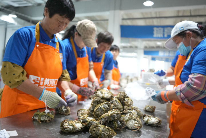 山東省東營市墾利區(qū)的一處大閘蟹加工車間的工作人員對新鮮的大閘蟹進(jìn)行分選和捆扎(2024年9月10日攝)。新華社記者 徐速繪 攝
