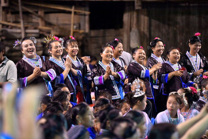 在廣西融水苗族自治縣桿洞鄉(xiāng)堯告村,村民們在觀看文藝演出(2024年8月13日攝)。新華社記者 黃孝邦 攝