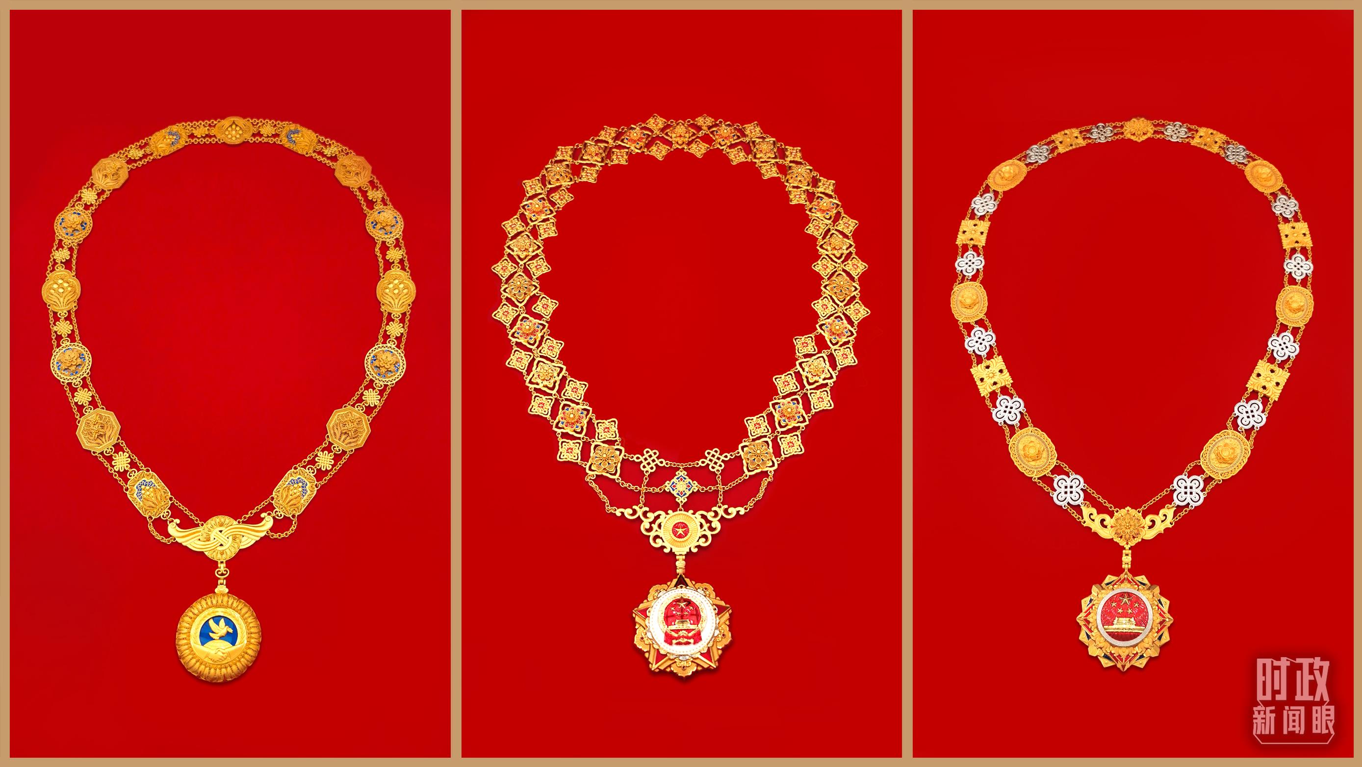 “共和國(guó)勛章”(中)、“友誼勛章”(左)和國(guó)家榮譽(yù)稱號(hào)獎(jiǎng)?wù)拢ㄓ遥?。(總臺(tái)央視記者郭鴻、鄂介甫拍攝)