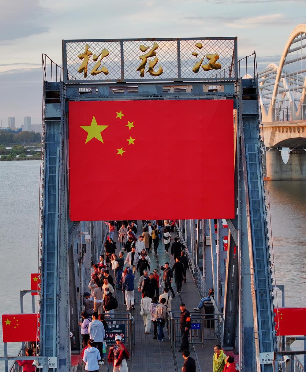 △2024年9月23日,黑龍江省哈爾濱市松花江濱洲鐵路橋披上百面國旗,慶祝新中國成立75周年。