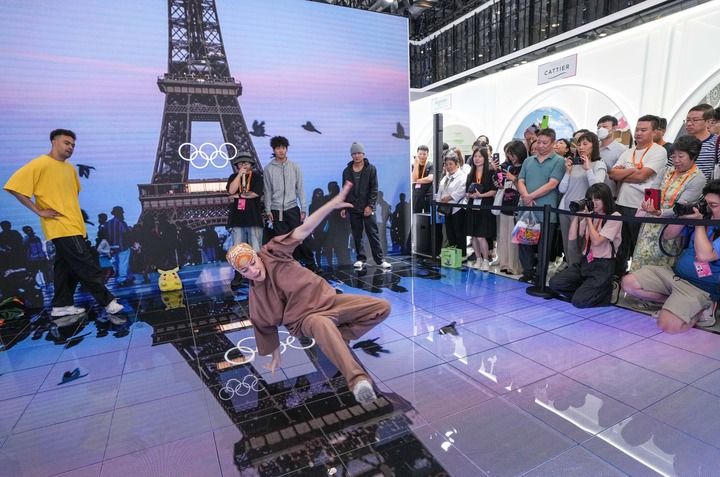 2024年9月14日,在2024年服貿會國家會議中心綜合展區(qū)的主賓國法國展臺,中法兩國街舞好手在表演霹靂舞。