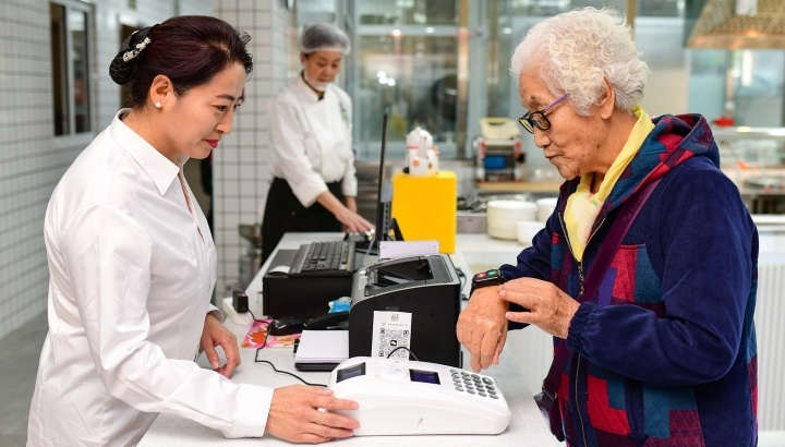 內蒙古鄂爾多斯,一位老人在“鄰里食堂”掃碼用餐