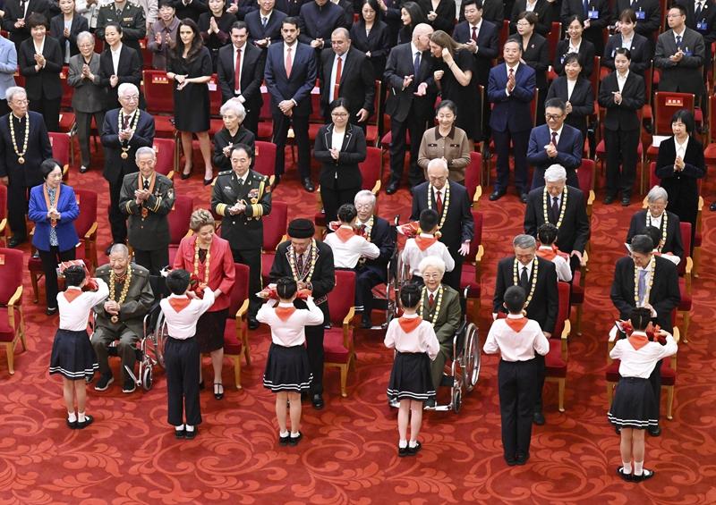 右手高舉過(guò)頭、敬少先隊(duì)隊(duì)禮……十幾天前,國(guó)家勛章和國(guó)家榮譽(yù)稱(chēng)號(hào)頒授現(xiàn)場(chǎng),少先隊(duì)員向功勛模范人物獻(xiàn)上鮮花,敬禮致意??缭綆状说膶?duì)視,連接光榮的歷史與充滿(mǎn)希望的未來(lái)。
