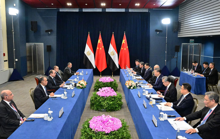 習(xí)近平祝賀并歡迎埃及首次作為正式成員參加金磚國家領(lǐng)導(dǎo)人會晤。習(xí)近平指出,今年是“中?;锇槟辍焙蛢蓢⑷鎽?zhàn)略伙伴關(guān)系10周年。中方堅定支持埃及維護國家主權(quán)、安全、發(fā)展利益,愿同埃方做守望相助的真誠朋友、攜手發(fā)展的親密伙伴。雙方要繼續(xù)堅定相互支持,鞏固政治互信,深化務(wù)實合作,高質(zhì)量共建“一帶一路”,密切人文交流,推動雙邊關(guān)系朝著構(gòu)建面向新時代的中埃命運共同體目標(biāo)持續(xù)邁進。中方也愿同埃方加強協(xié)調(diào),推動“大金磚合作”行穩(wěn)致遠,進一步提升全球南方影響力和發(fā)言權(quán),維護發(fā)展中國家共同利益。