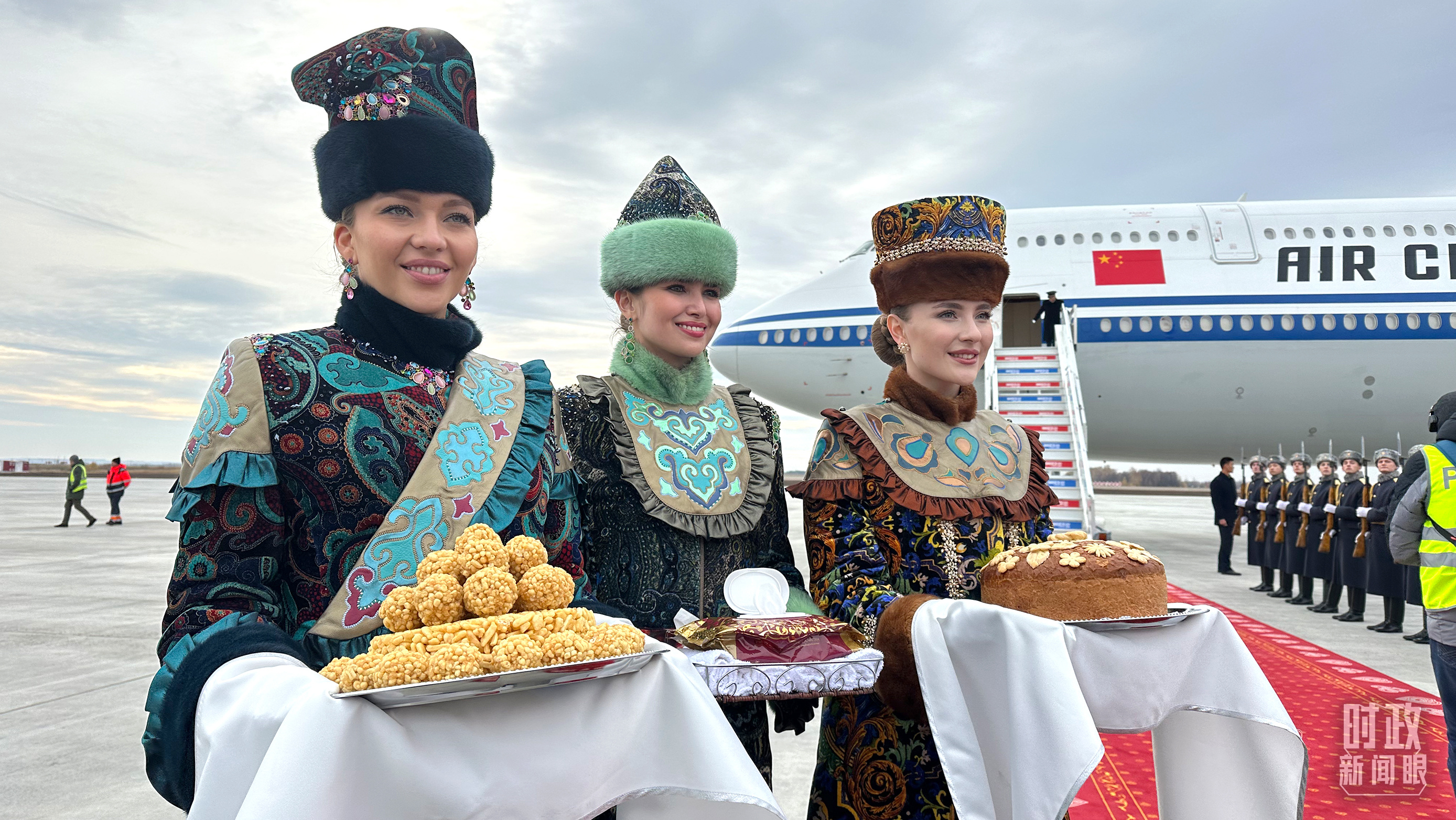 習(xí)主席專機(jī)抵達(dá)喀山國際機(jī)場(chǎng)時(shí),禮兵在紅毯兩側(cè)列隊(duì)致敬,身著民族服裝的俄羅斯女青年用傳統(tǒng)禮節(jié)表示歡迎。(總臺(tái)央視記者盧心雨拍攝)