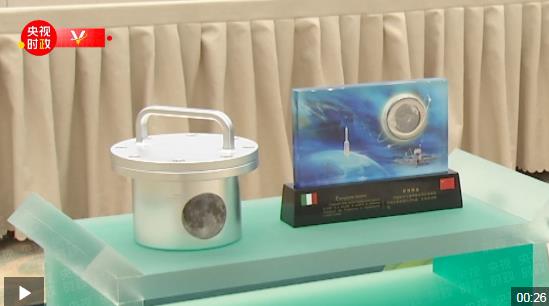 工藝擺件以嫦娥五號探月為設(shè)計元素,月球部分裝有月壤。科研樣品為月壤鏟取樣和鉆取樣,展現(xiàn)了中意航天領(lǐng)域合作高水平。
