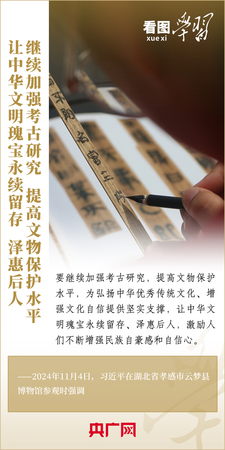 11月4日,習近平總書記在湖北省孝感市云夢縣博物館參觀出土秦漢簡牘展。這里收藏的我國考古史上首次發(fā)現(xiàn)的秦簡——云夢睡虎地秦簡,反映了戰(zhàn)國晚期到秦始皇時期的政治、經濟、文化、法律、軍事等方面的情況。習總書記詳細聽取簡牘內容、歷史文化價值和保護研究情況介紹,指出要繼續(xù)加強考古研究,提高文物保護水平,讓中華文明瑰寶永續(xù)留存、澤惠后人。