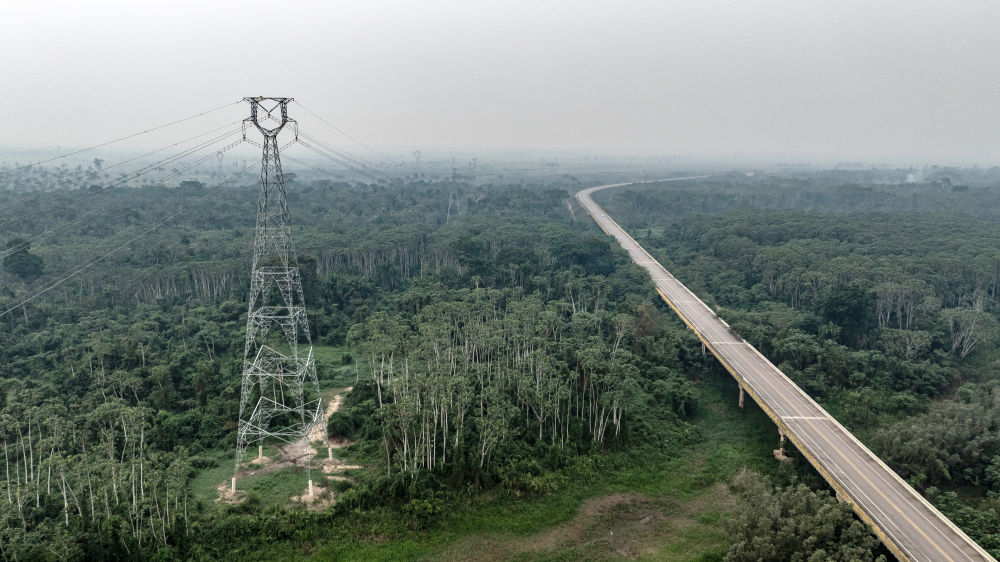 這張9月13日拍攝的照片顯示,在巴西朗多尼亞州,EDP輸變電項(xiàng)目線路穿越熱帶雨林(無人機(jī)照片)。巴西EDP輸變電項(xiàng)目是位于巴西北部的阿克里州和朗多尼亞州的綠地輸變電工程,山東電建一公司承擔(dān)了該項(xiàng)目的EPC總承包任務(wù)。新華社記者王天聰攝
