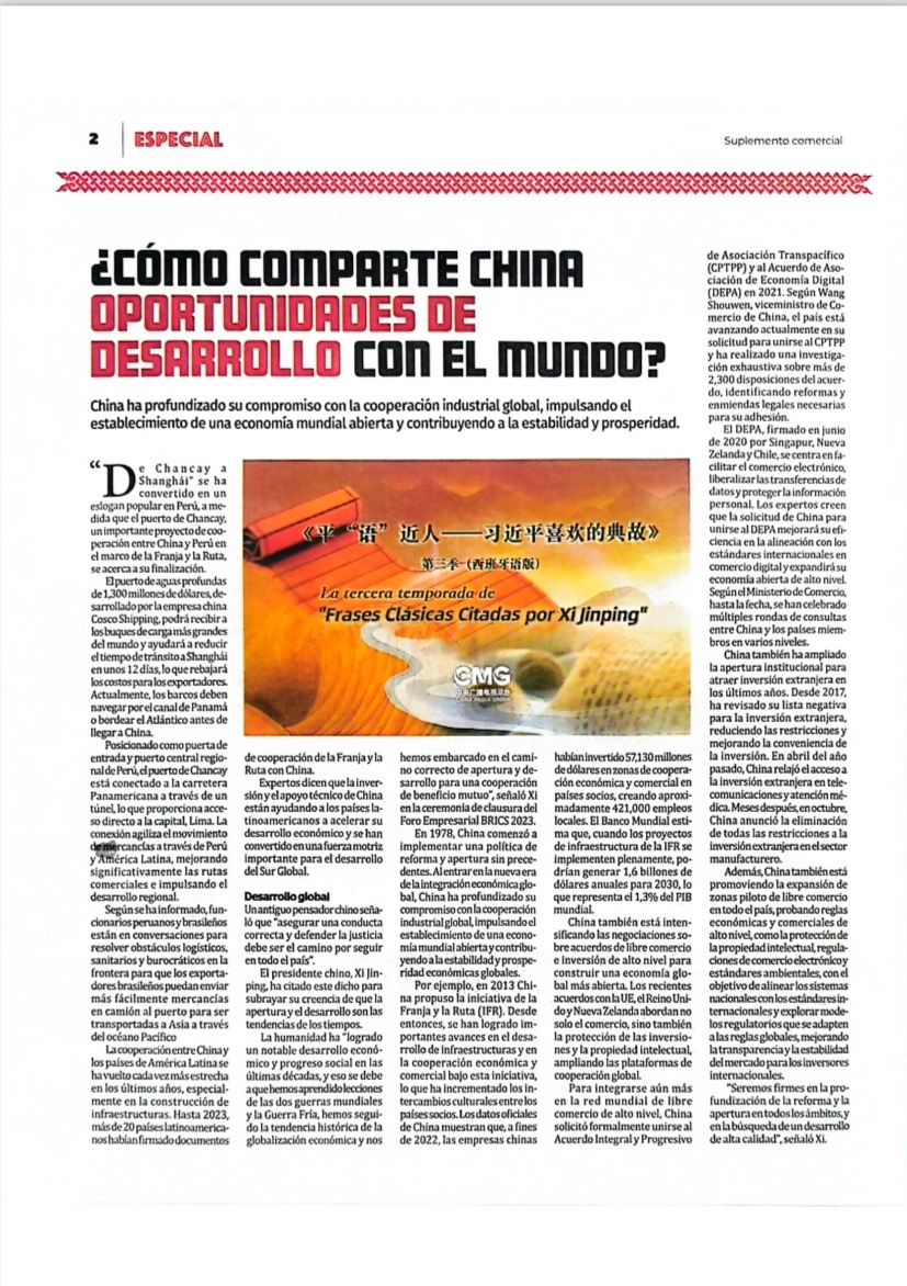 11月14日,秘魯最具影響力的官方報紙《秘魯人報》刊發(fā)節(jié)目在秘魯落播的消息。文章指出,《平“語”近人——習(xí)近平喜歡的典故》第三季展現(xiàn)了中華民族開放包容、兼收并蓄的文化胸懷,闡釋了習(xí)近平主席提出的推動構(gòu)建人類命運共同體的這一重大理念,是對“建設(shè)一個什么樣的世界、怎樣建設(shè)這個世界”給出的中國方案。《秘魯人報》特刊整版刊發(fā)《平“語”近人——習(xí)近平喜歡的典故》第三季(西班牙語版)將在秘魯主流媒體落播特稿?!睹佤斎藞蟆饭倬W(wǎng)也同步刊發(fā)了節(jié)目預(yù)告消息和海報。
