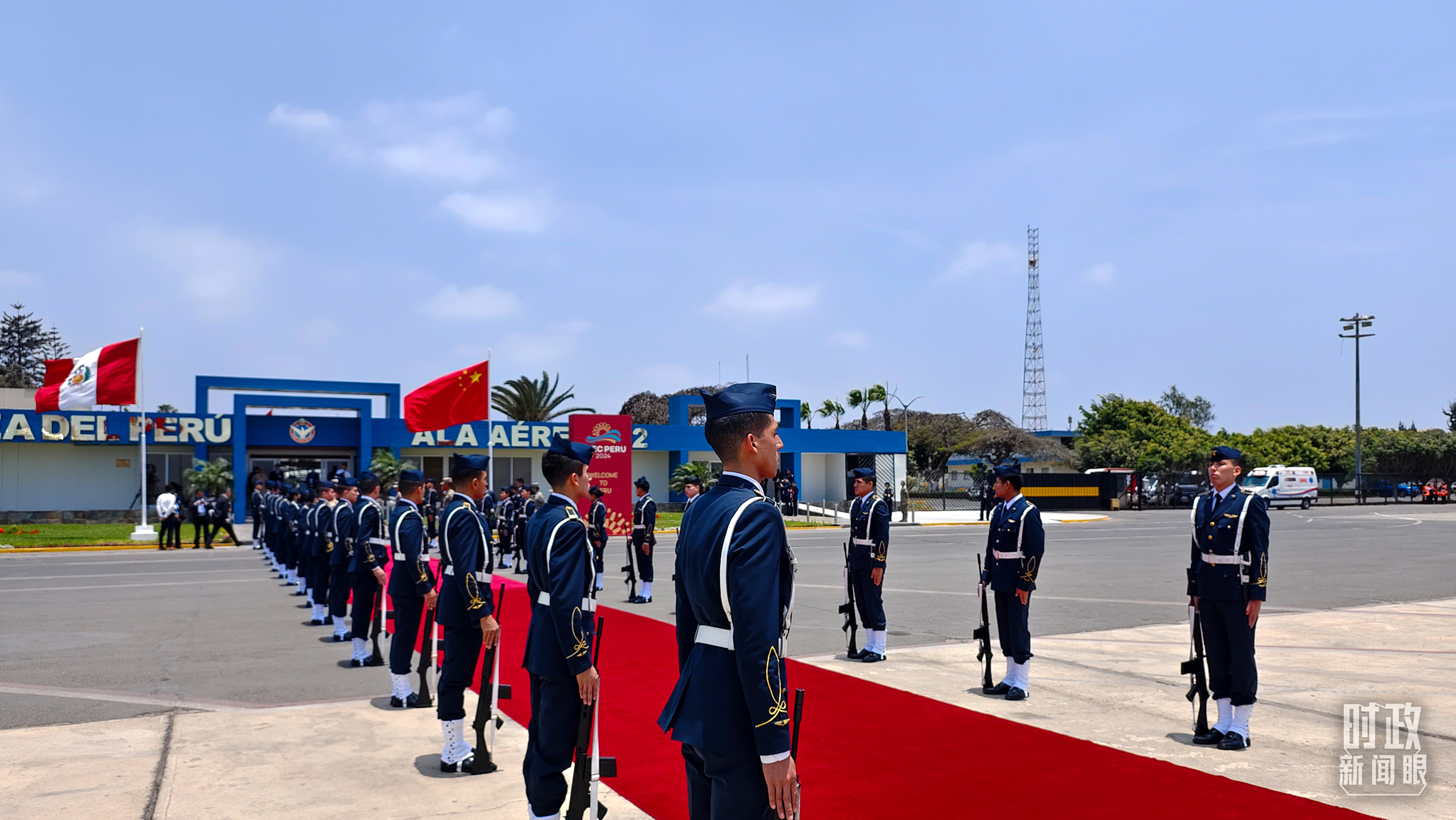 △利馬空軍基地,秘魯禮兵分列紅毯兩側迎接習主席到訪。(總臺央視記者韓銳拍攝)