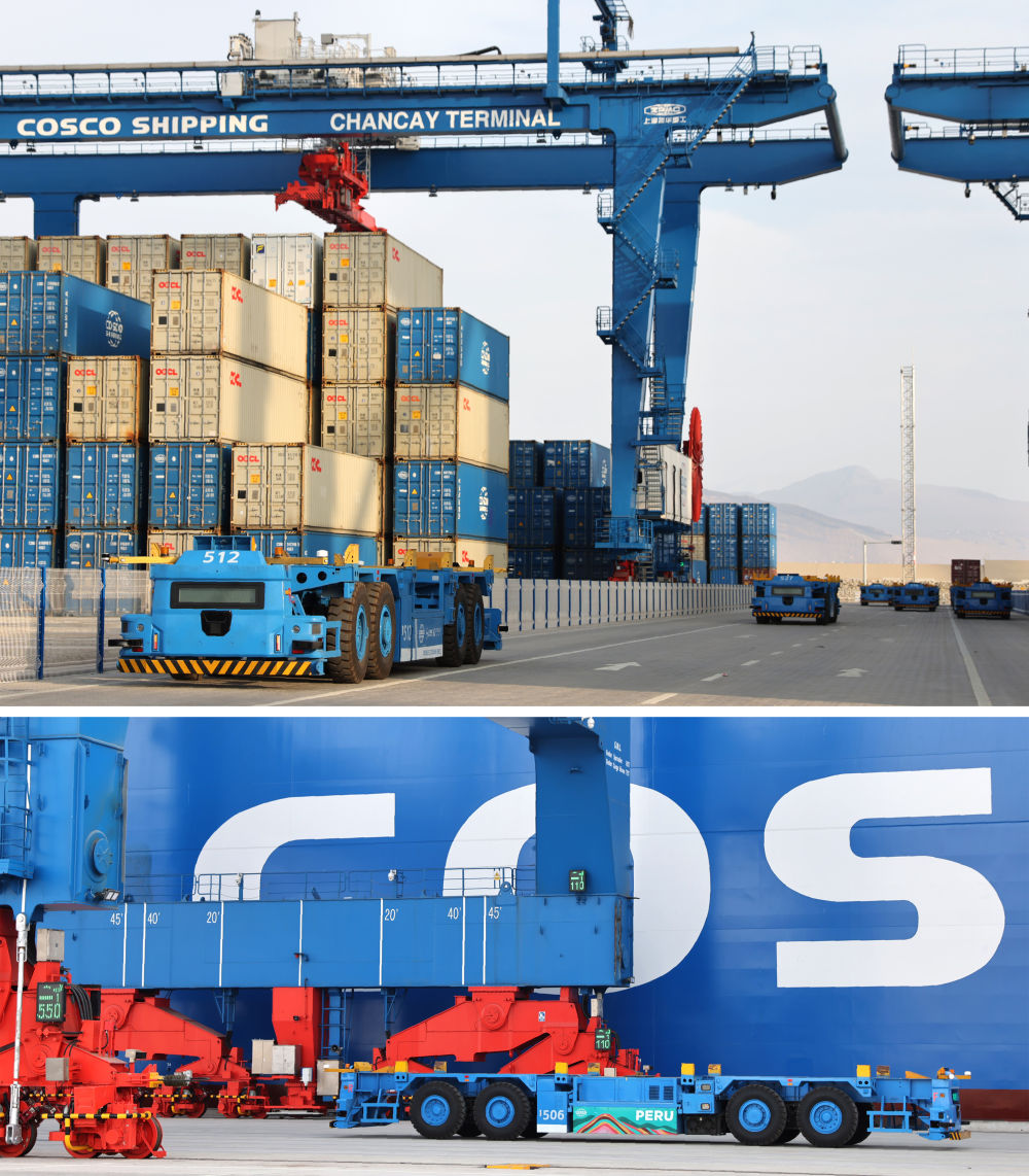 2024年11月14日,自動(dòng)駕駛電動(dòng)集裝箱卡車穿梭在秘魯錢凱港碼頭操作區(qū)。