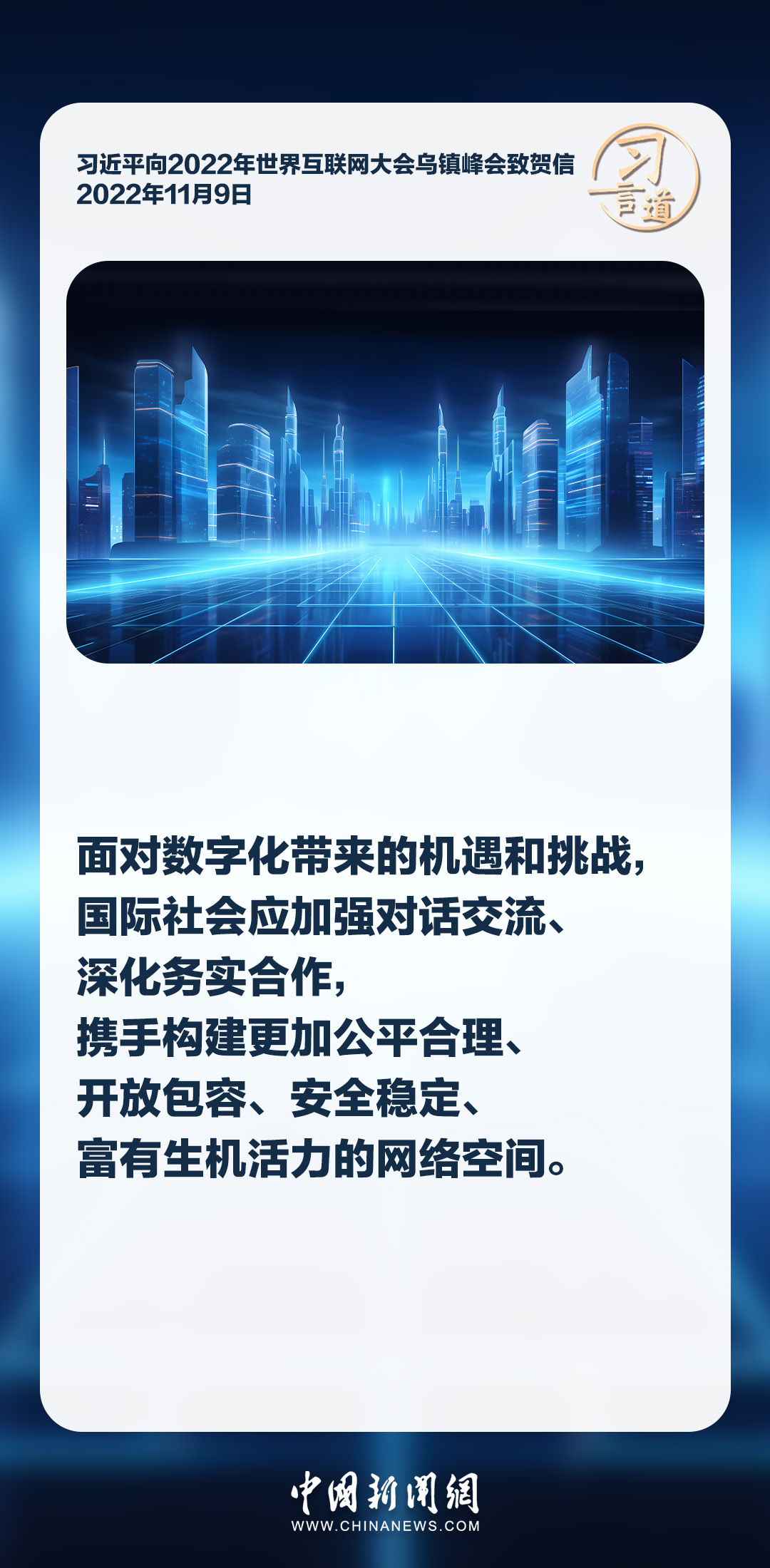 信息革命時代潮流浩蕩前行,網(wǎng)絡空間承載著人類對美好未來的無限憧憬。習近平主席多次強調(diào)各國應該共同構建網(wǎng)絡空間命運共同體,推動網(wǎng)絡空間互聯(lián)互通、共享共治,為開創(chuàng)人類發(fā)展更加美好的未來助力。