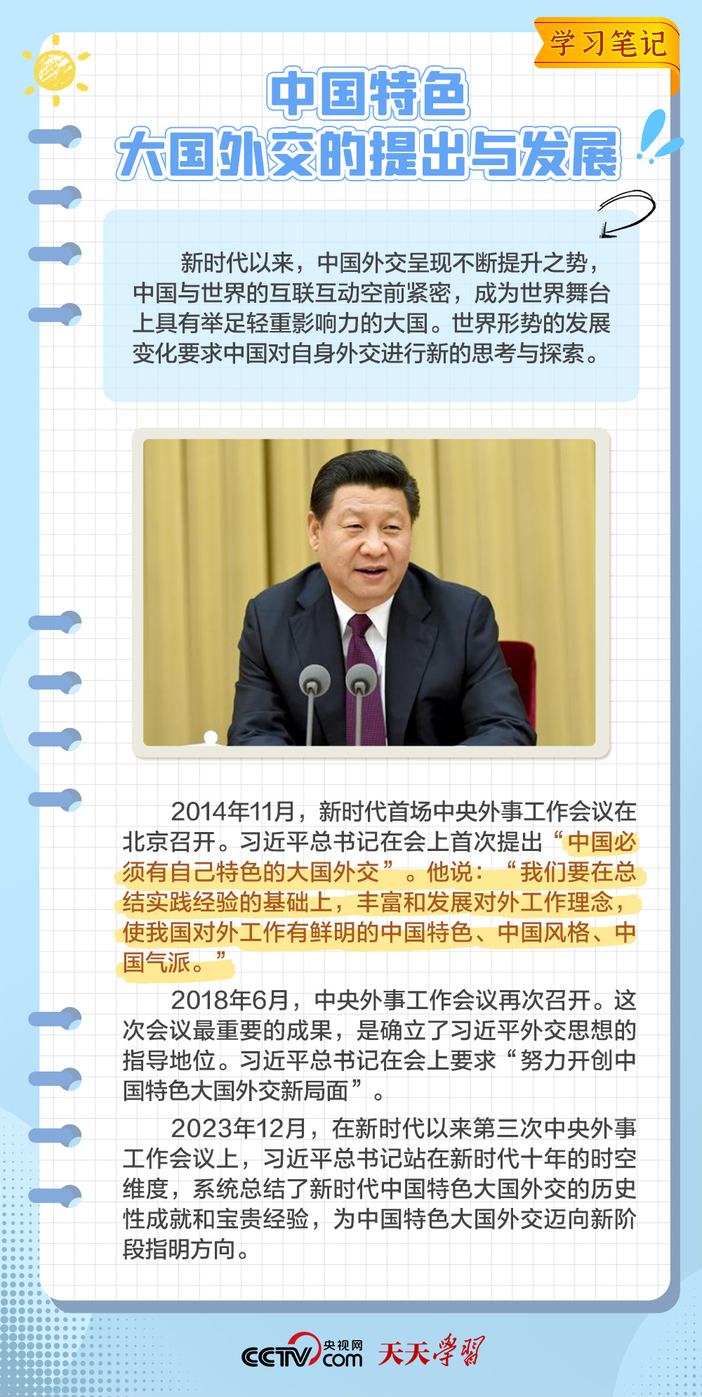 天天學習2014年11月,習近平總書記在中央外事工作會議上指出,中國必須有自己特色的大國外交。