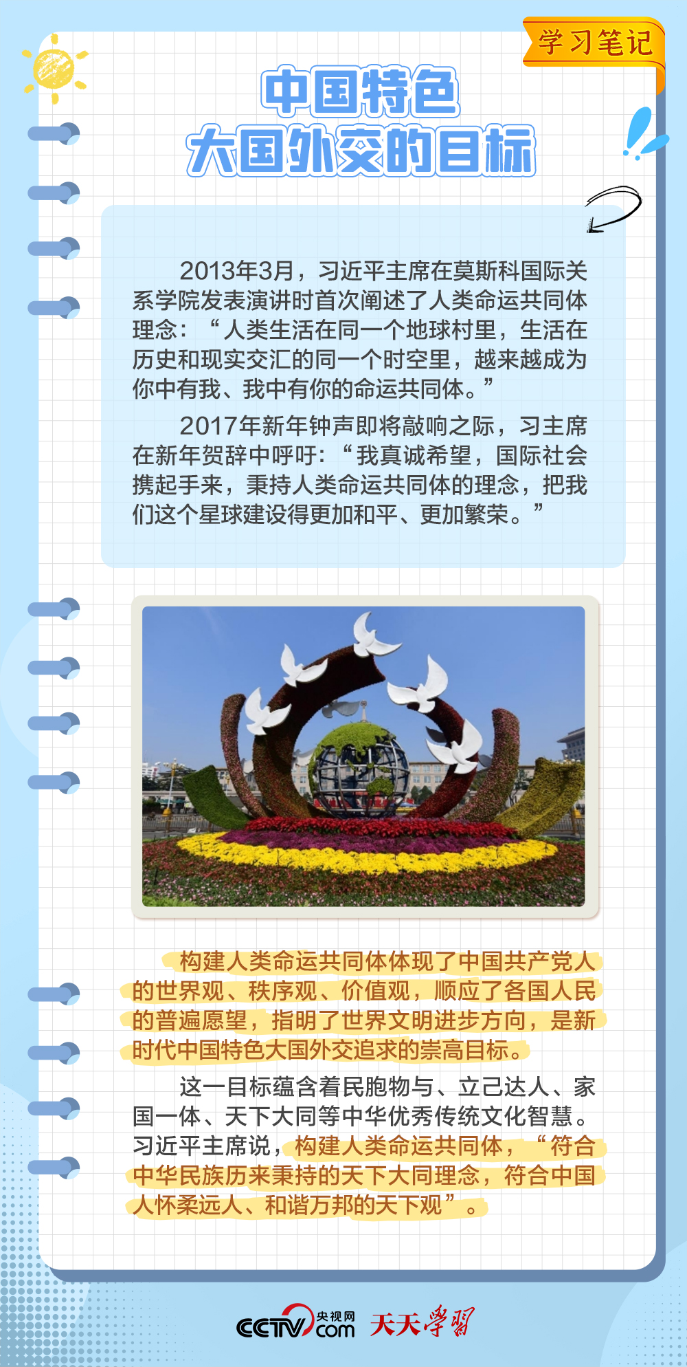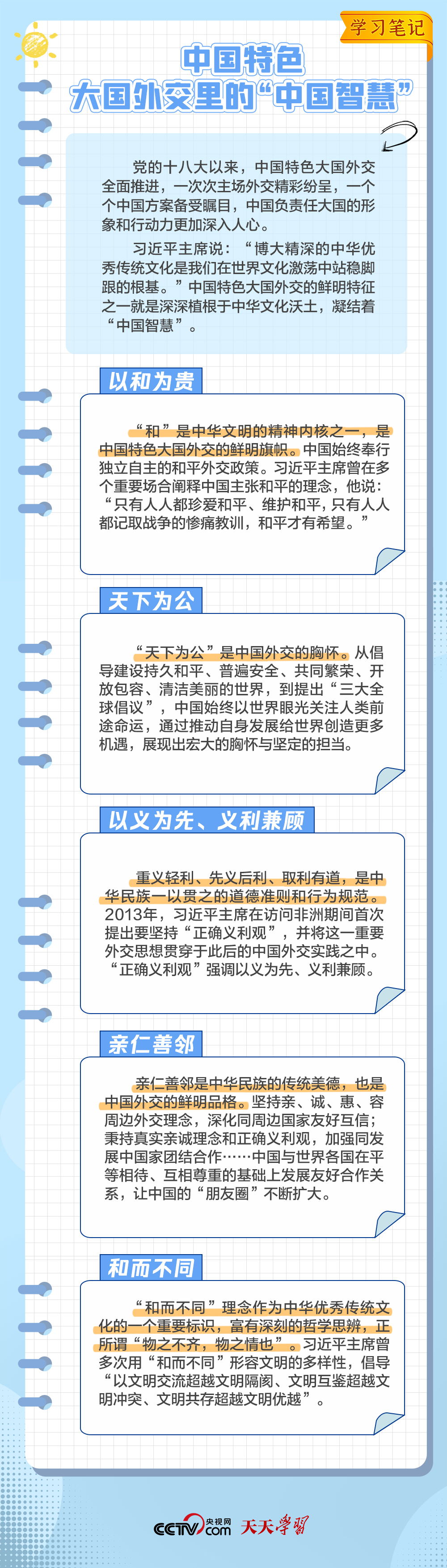 10年來,面對風云變幻的國際形勢,中國特色大國外交扎實推進,形成了全方位、多層次、立體化的外交布局,為我國高質量發(fā)展營造了良好外部環(huán)境。中國特色大國外交提出10周年之際,《學習筆記》特梳理其內涵要義,與您一同感悟其中蘊含的“中國智慧”。