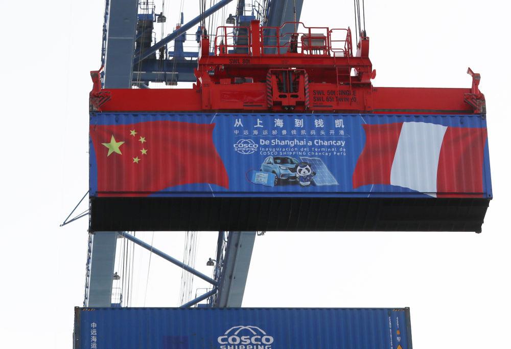 2024年11月14日,在秘魯首都利馬以北的錢凱港,岸邊智能化設備吊裝集裝箱。