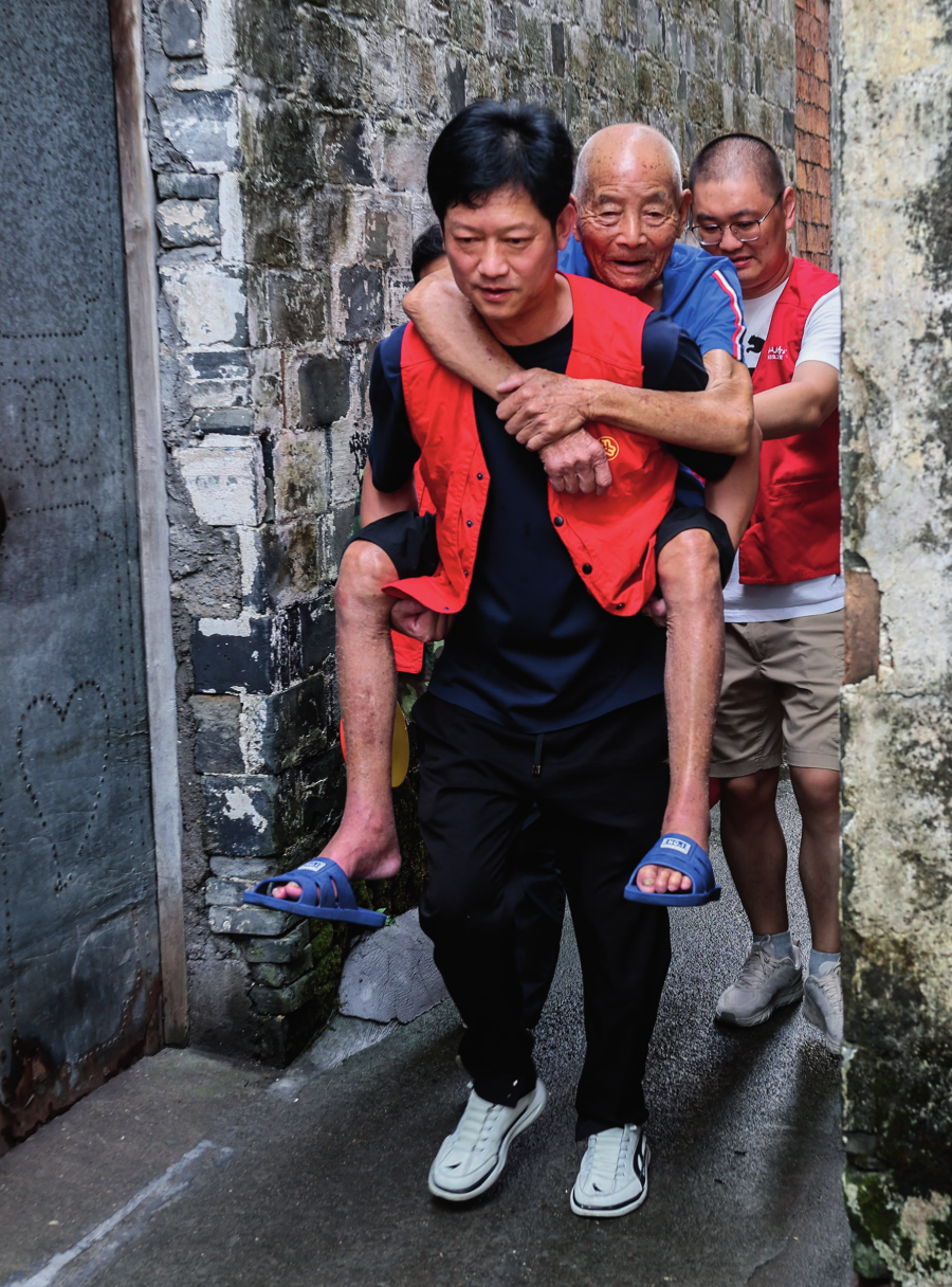 浙江省諸暨市趙家鎮(zhèn)泉畈村村干部和黨員志愿者在臺風來臨前轉移危舊房里的老人(2024年9月19日攝)徐昱 攝