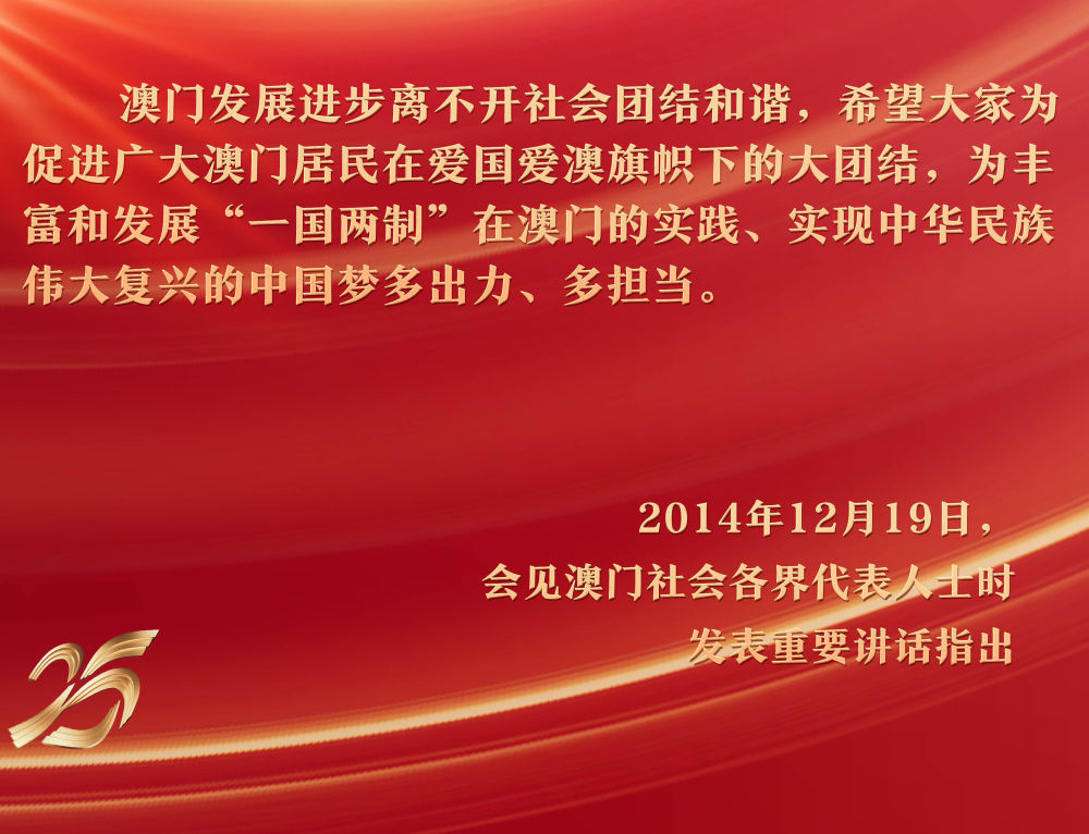 25年來,澳門社會(huì)各界在愛國(guó)愛澳的旗幟下實(shí)現(xiàn)廣泛團(tuán)結(jié),愛國(guó)愛澳力量在社會(huì)政治生活中始終占據(jù)主導(dǎo),為特區(qū)政府依法有效施政、確?!耙粐?guó)兩制”在澳門成功實(shí)踐奠定了堅(jiān)實(shí)的基礎(chǔ)。