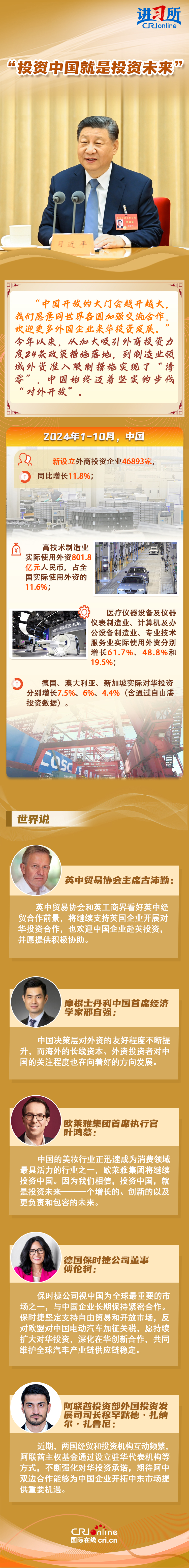 “中國是實(shí)干家、行動(dòng)派?!苯衲暌詠恚瑥牧?xí)近平主席的歐洲之行到拉美之行,再到四天前在北京會(huì)見主要國際經(jīng)濟(jì)組織負(fù)責(zé)人,習(xí)近平一直強(qiáng)調(diào),中國的發(fā)展將給世界帶來巨大機(jī)遇。據(jù)聯(lián)合國貿(mào)易和發(fā)展會(huì)議不久前發(fā)布的《世界投資報(bào)告2024》中文版顯示,中國吸引外資的結(jié)構(gòu)不斷優(yōu)化、質(zhì)量不斷提高,多位政商界人士也認(rèn)為中國是一個(gè)非常有前景的市場,投資中國就是投資未來。