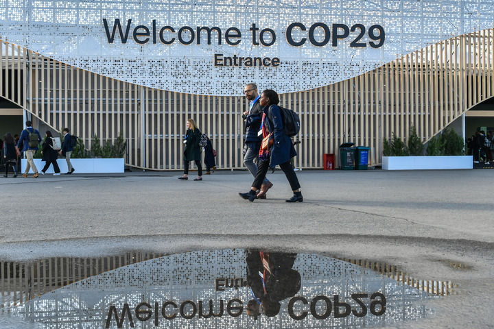 2024年11月15日,在阿塞拜疆首都巴庫,人們經(jīng)過聯(lián)合國氣候變化巴庫大會的會場。新華社記者 曹陽 攝