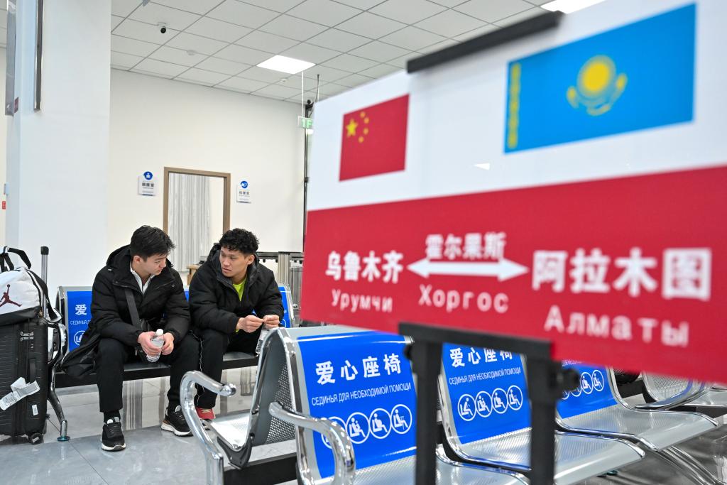 1月8日,在烏魯木齊陸港國(guó)際客運(yùn)站,伊利亞索夫·安瓦爾(左)和同學(xué)在候車廳等候前往阿拉木圖的國(guó)際班車。新華社記者丁磊 攝