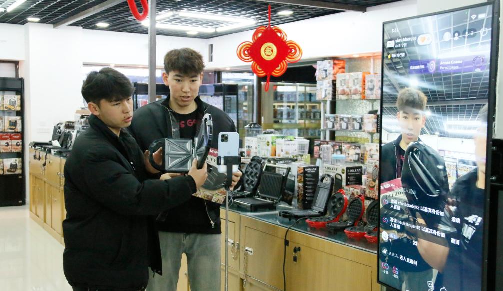 2月18日,在中哈霍爾果斯國(guó)際邊境合作中心的義烏國(guó)際商貿(mào)城里,跨境電商主播向中亞消費(fèi)者介紹中國(guó)商品。(馬婷婷 攝)