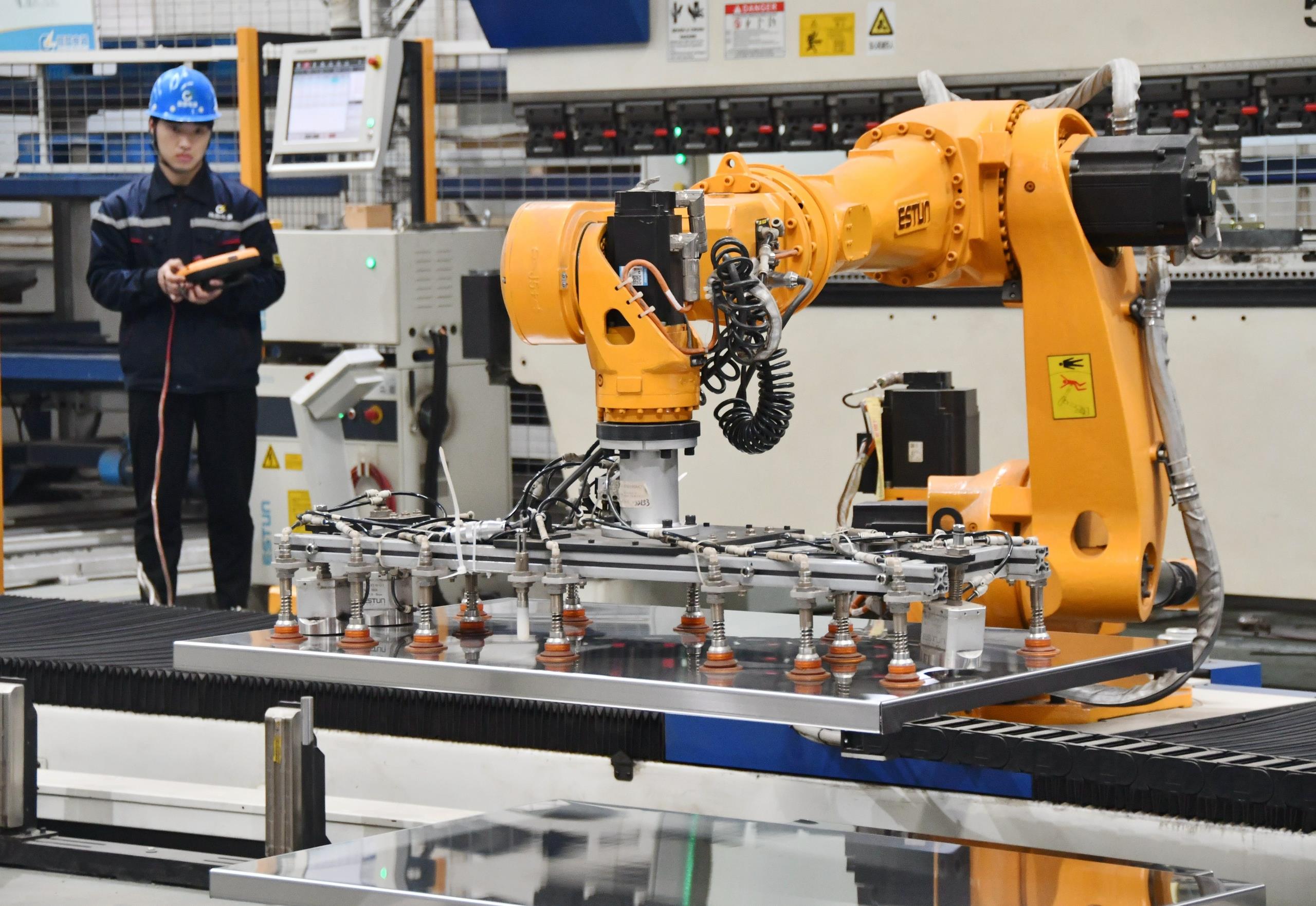 2025年2月21日,河北邯鄲永年區(qū)工業(yè)園區(qū)的一家企業(yè),工人正在操控工業(yè)機(jī)器人作業(yè)。