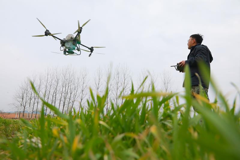 2025年2月14日,在浙江杭州市臨安區(qū)天目山鎮(zhèn)“天目糧倉(cāng)”糧食功能區(qū),農(nóng)機(jī)人員遙控植保無(wú)人機(jī)給小麥?zhǔn)┓省?/p>