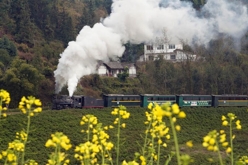 2025年2月14日,四川樂山市犍為縣菜子壩景點(diǎn)試種的早季油菜花進(jìn)入盛開期,蒸汽小火車穿越油菜花海,吸引不少游客前來(lái)觀看。