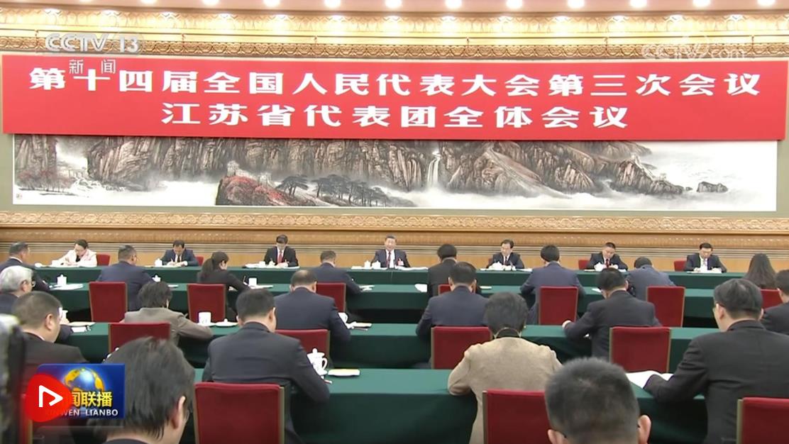 在聽取大家發(fā)言后,習(xí)近平作了發(fā)言。他首先表示贊成政府工作報告,對江蘇工作予以肯定,希望江蘇落實好挑大梁的責任,努力取得新的更大成績。