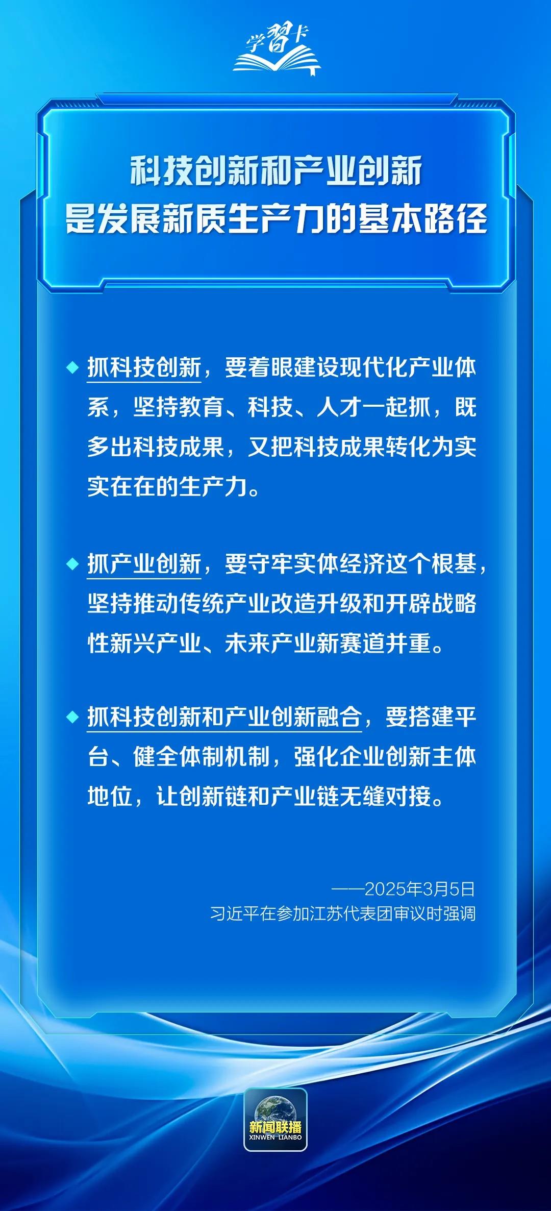 2025年全國兩會期間,習近平總書記參加團組審議討論時,多次提到科技創(chuàng)新這一關鍵命題,強調(diào)“科技創(chuàng)新和產(chǎn)業(yè)創(chuàng)新,是發(fā)展新質生產(chǎn)力的基本路徑”。一起學習↓