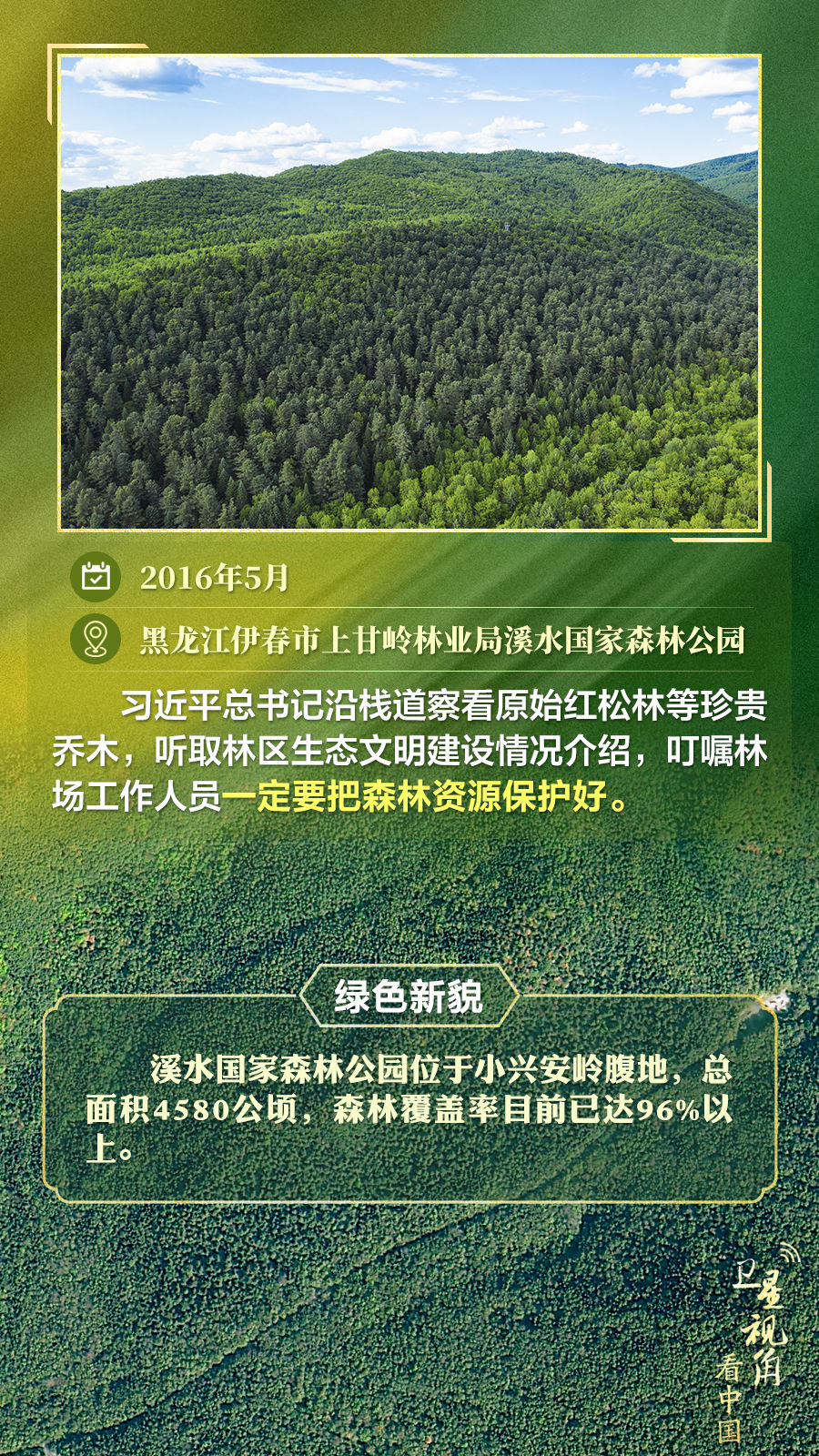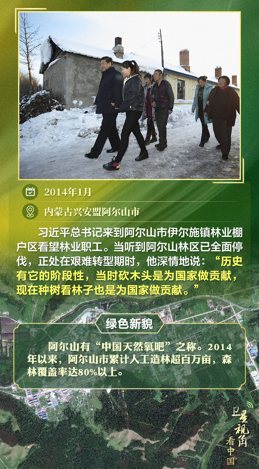 通過衛(wèi)星視角,一起俯瞰總書記去過的這些林區(qū),重溫總書記對(duì)造林護(hù)林的殷殷囑托,感受綠色新貌。