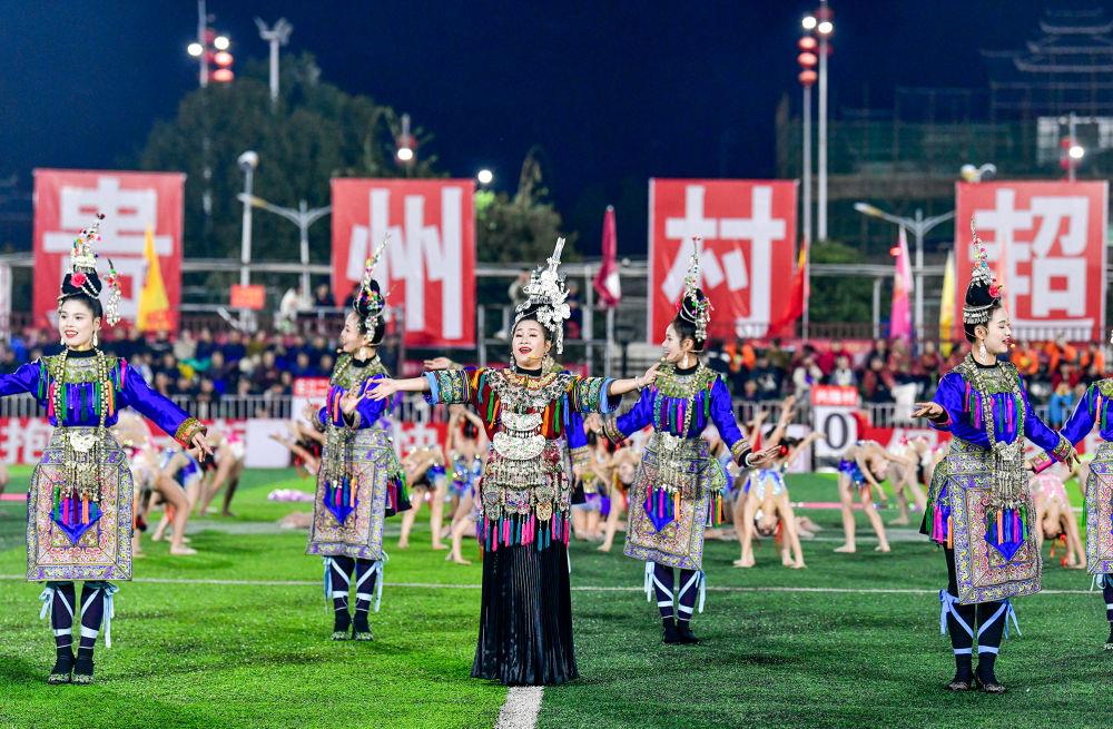 2025年3月14日,2025年貴州“村超”40強(qiáng)交叉賽在榕江“村超”足球場舉行,演員在比賽間隙表演侗族大歌。