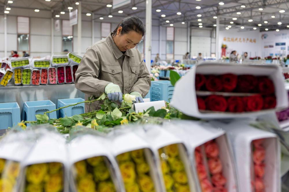 △近日,工作人員在云南麗江現(xiàn)代花卉產業(yè)園包裝鮮花。