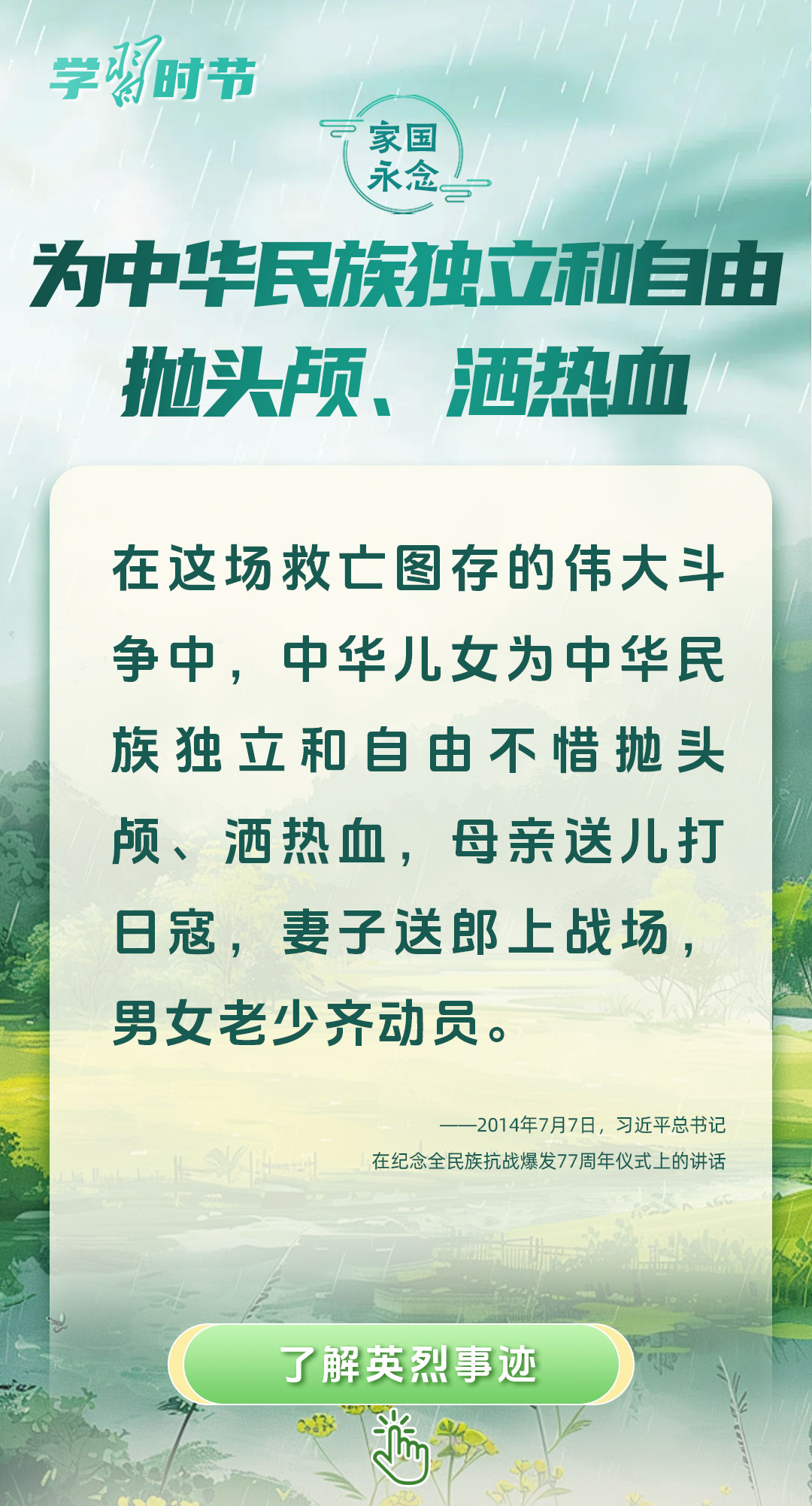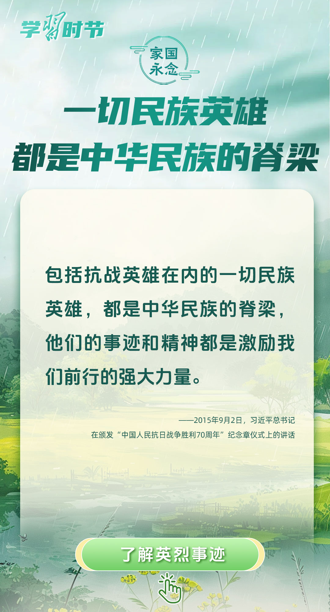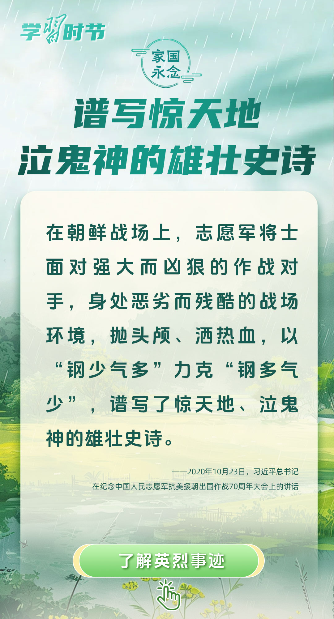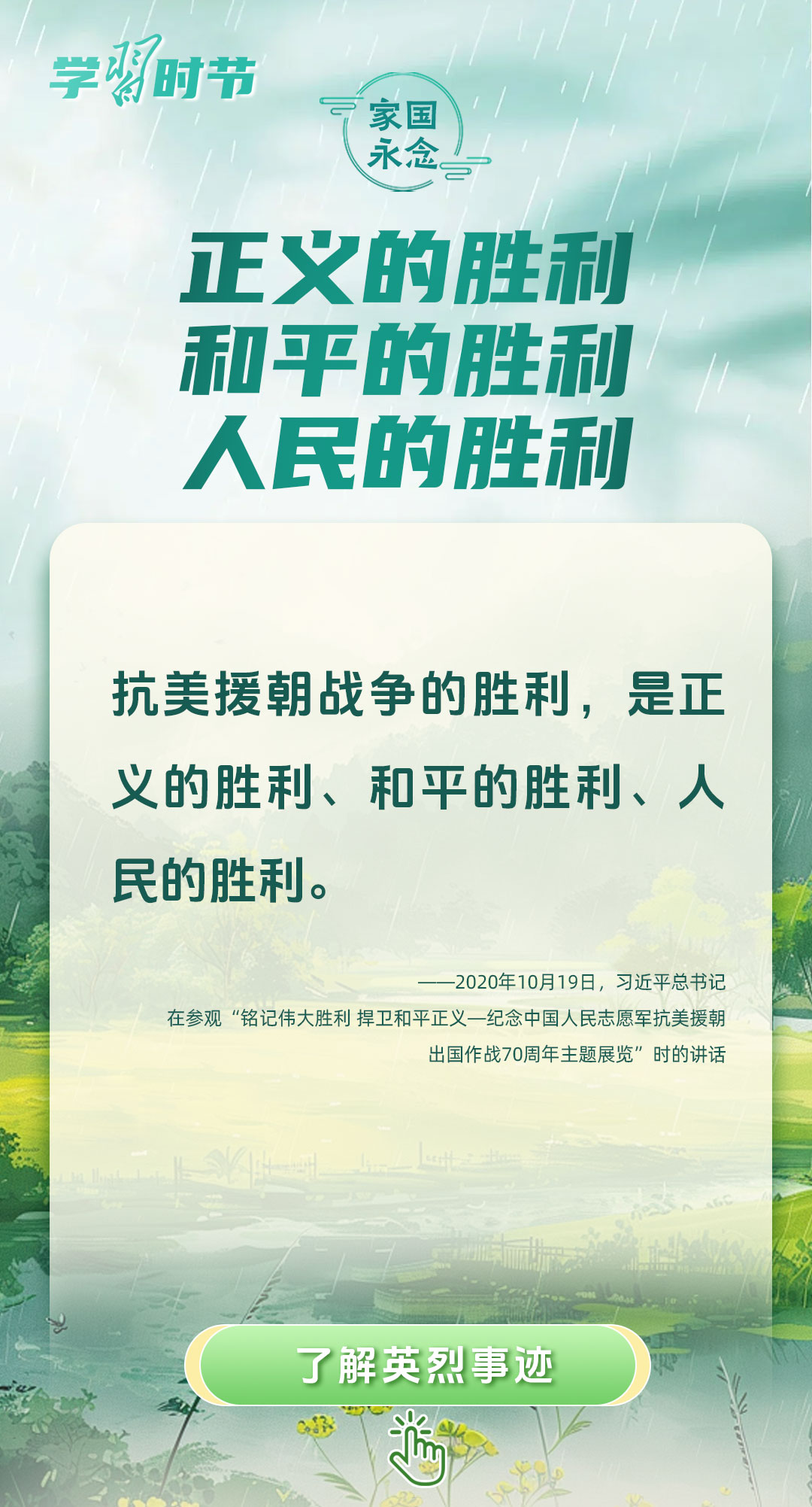 今年是中國人民抗日戰(zhàn)爭暨世界反法西斯戰(zhàn)爭勝利80周年、中國人民志愿軍抗美援朝出國作戰(zhàn)75周年。習(xí)近平總書記曾說:“對一切為國家、為民族、為和平付出寶貴生命的人們,不管時代怎樣變化,我們都要永遠(yuǎn)銘記他們的犧牲和奉獻(xiàn)。”今天我們所擁有的一切,無不凝結(jié)著英雄、英烈們的奉獻(xiàn)付出乃至巨大犧牲。