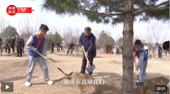 植樹期間,習(xí)近平詢問孩子們的學(xué)習(xí)生活和勞動(dòng)鍛煉情況,并同在場的干部群眾親切交談。