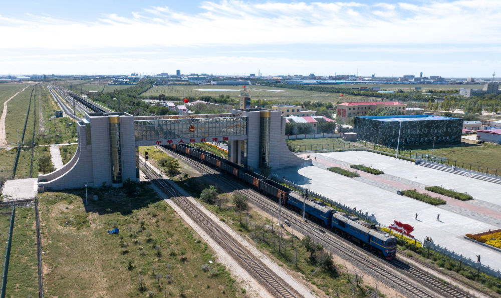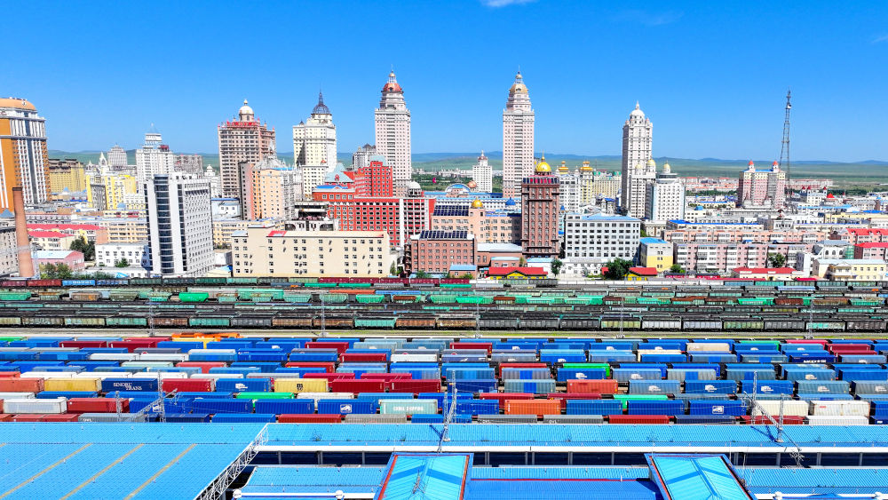 2024年8月20日,中歐班列在內蒙古滿洲里口岸準備出境(無人機照片)。滿洲里口岸位于中俄蒙三國交界處,是中國最大的陸路口岸,也是連接俄羅斯、蒙古國的重要樞紐。2024年,滿洲里口岸中歐班列通行量突破4000列,為推進高質量共建“一帶一路”注入新動能。