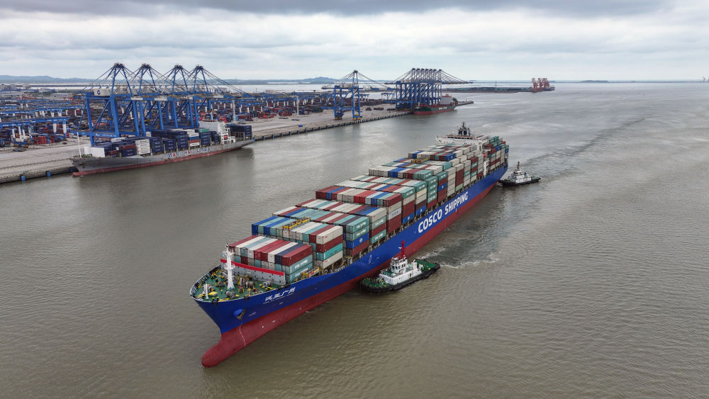 2024年5月19日,一艘海輪在廣西欽州港碼頭靠泊(無人機照片)。欽州港是北部灣港的組成部分,也是中國西南地區(qū)通往東盟的重要出???。西部陸海新通道利用鐵路、公路、水運等多種運輸方式,由重慶一路向南,經廣西北部灣出海通達世界各地。截至2025年1月1日,北部灣港總航線達80條,其中外貿航線49條,基本實現(xiàn)國內主要港口和東南亞、東北亞主要港口全覆蓋。
