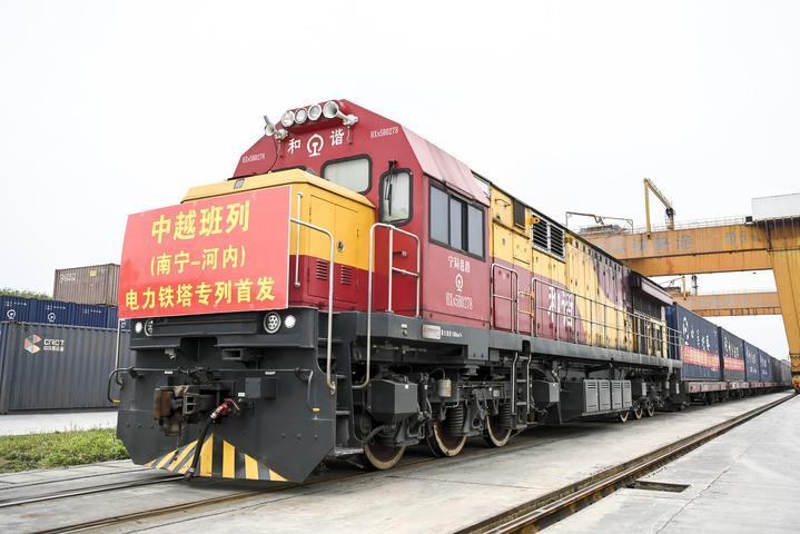 2024年3月8日,在廣西南寧國(guó)際鐵路港,電力鐵塔專(zhuān)列準(zhǔn)備發(fā)車(chē)。當(dāng)日,一列滿載340噸電力鐵塔的中越班列從南寧國(guó)際鐵路港開(kāi)出,發(fā)往越南河內(nèi)。新華社記者 曹祎銘 攝