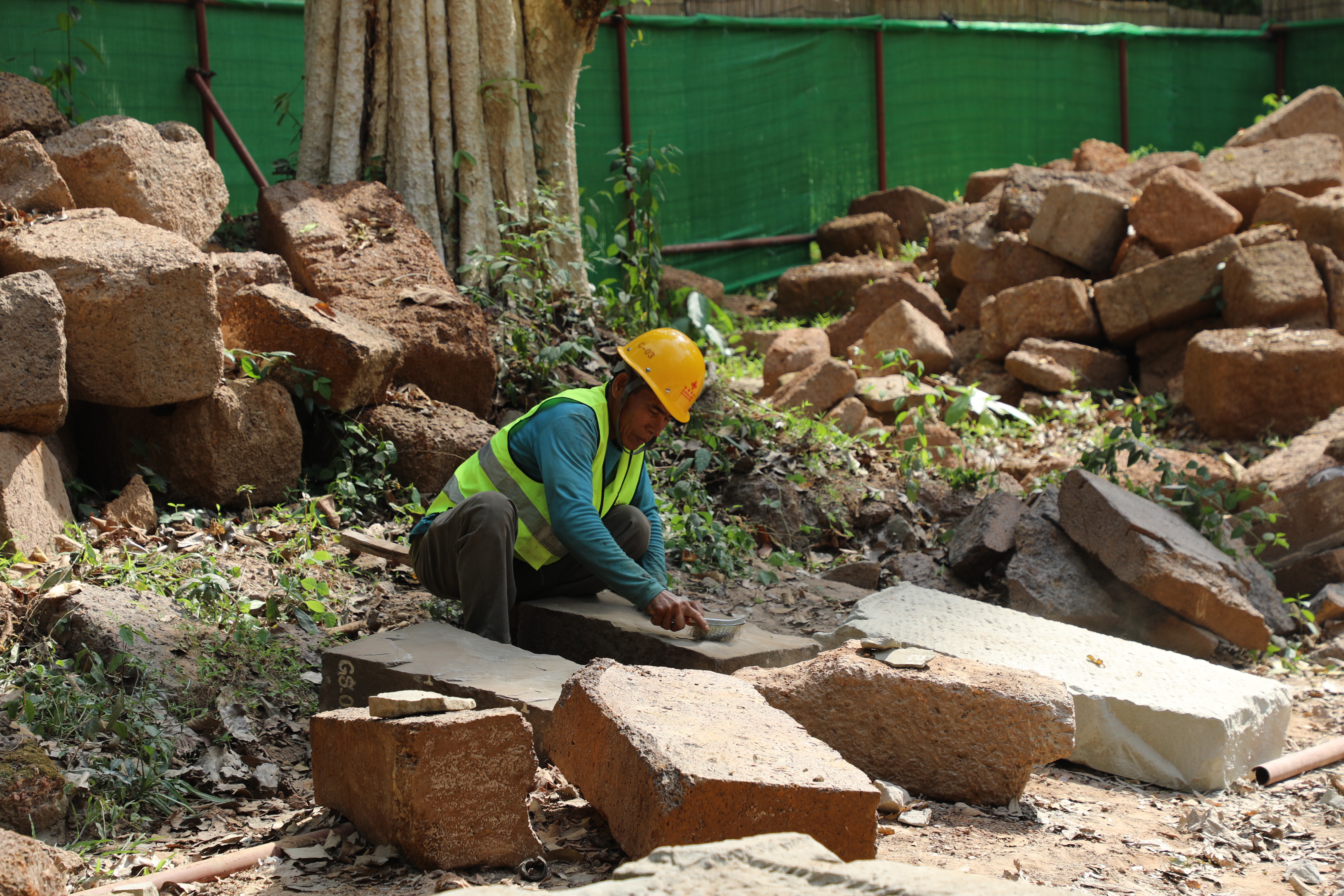 一名柬埔寨工人正在王宮遺址修復(fù)現(xiàn)場(chǎng)工作。(人民日?qǐng)?bào)記者曹師韻 攝)