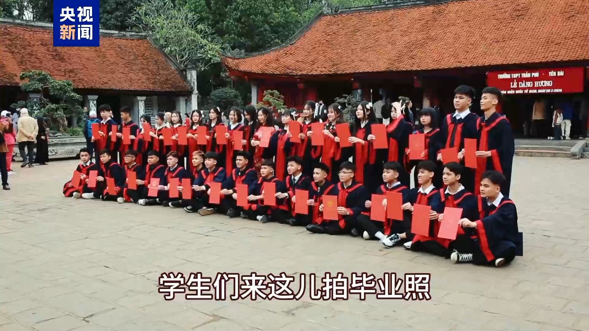 越南女學(xué)生:因?yàn)檫@里是一個(gè)神圣的地方,學(xué)生們來這兒拍畢業(yè)照,大家來文廟祭拜,希望能取得更好的學(xué)習(xí)成績(jī)。