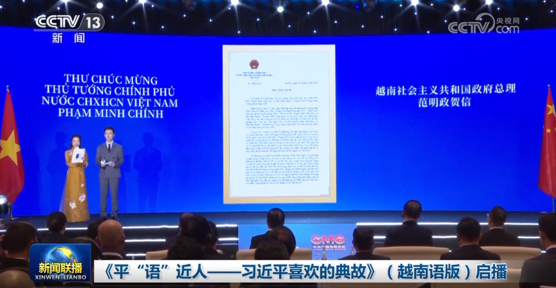 在中共中央總書(shū)記、國(guó)家主席習(xí)近平對(duì)越南進(jìn)行國(guó)事訪問(wèn)之際,4月14日,由中國(guó)中央廣播電視總臺(tái)制作的《平“語(yǔ)”近人——習(xí)近平喜歡的典故》(越南語(yǔ)版)在越南啟播。慶祝中越建交75周年人文交流活動(dòng)同日在河內(nèi)舉行。越南總理范明政致賀信,對(duì)節(jié)目播出和活動(dòng)成功舉辦表示祝賀。
