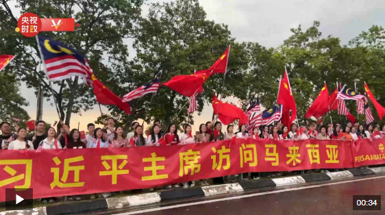 習近平乘車從機場赴下榻飯店途中,當?shù)厝A僑華人在道路兩旁揮舞中馬兩國國旗,高舉“熱烈歡迎習近平主席訪問馬來西亞”、“中馬友誼萬歲”的紅色橫幅,以喜慶熱烈的舞獅表演歡迎習近平主席到訪。