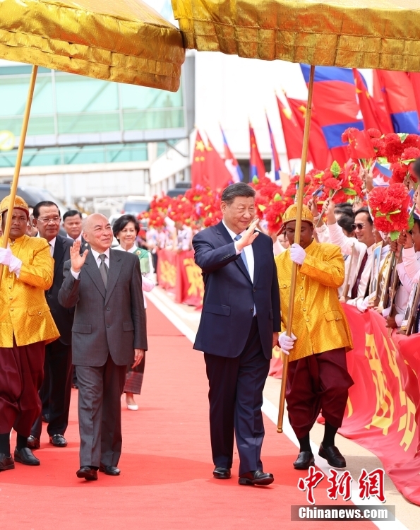 習(xí)近平抵達柬埔寨時,在停機坪現(xiàn)場,禮兵分列紅毯兩側(cè),軍樂團奏起中柬兩國國歌,數(shù)百名當?shù)孛癖姄]舞中柬國旗,歡迎鐵桿朋友再次到訪。