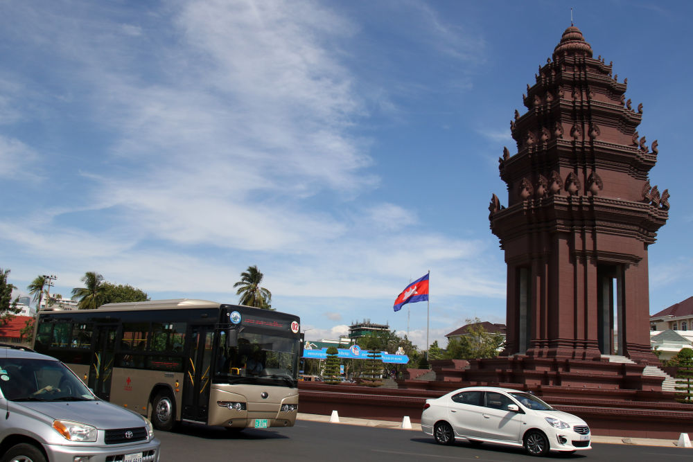 2018年1月5日,在柬埔寨金邊,一輛中國援助的“宇通”公交車經(jīng)過獨立紀(jì)念碑。